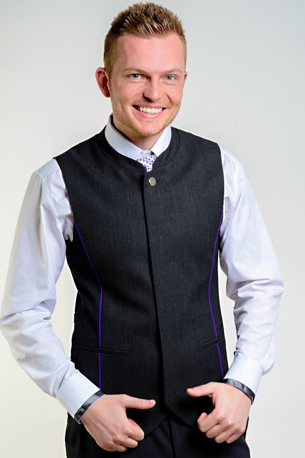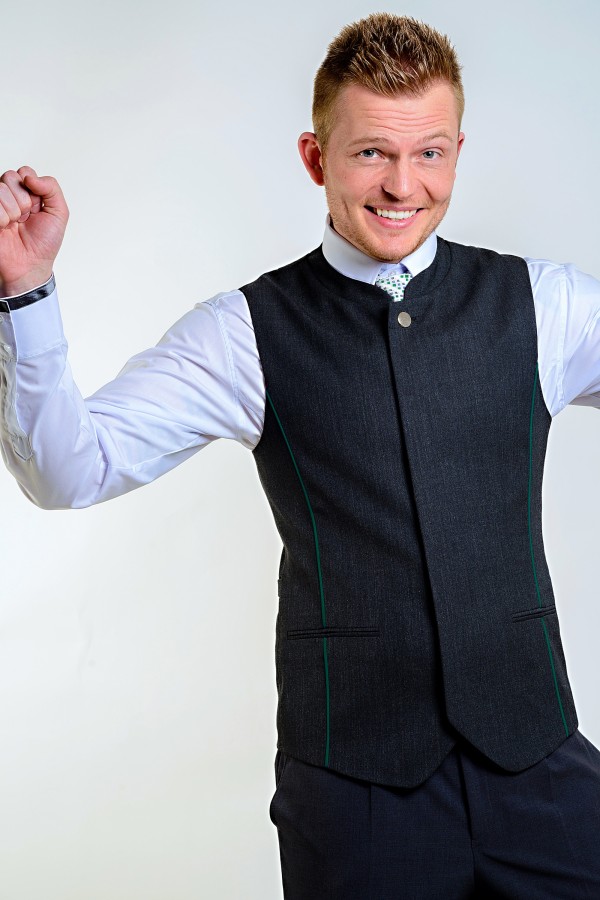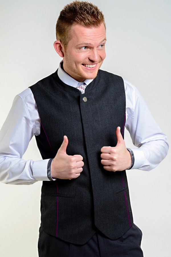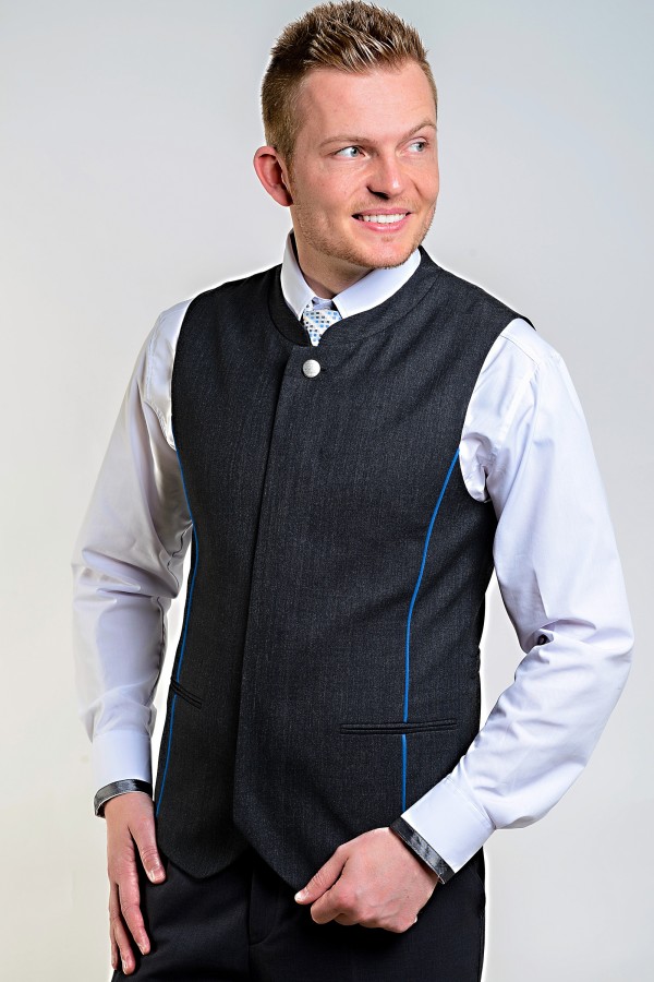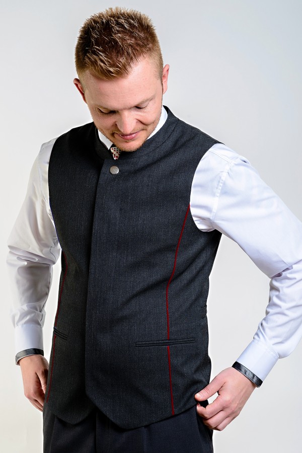 pánská vesta s barevnou výpustkou a malým stojáčkem v průkrčníku, zapínaná na knoflíky
