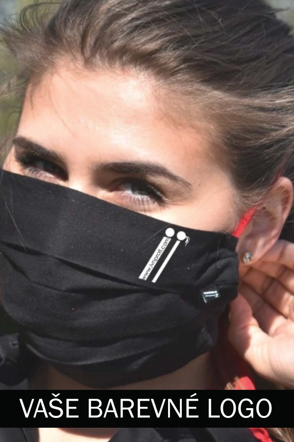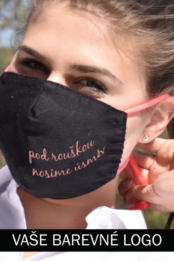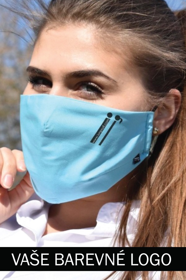 Logování roušek – barevný tisk - logo tištěné – logo se musí tisknout na rozešitou roušku, uprostřed dvou šicích operací, logování je tedy náročnější na čas a logistiku. Cena: 36 Kč bez DPH od 50 kusů, 56 Kč do 50 kusů