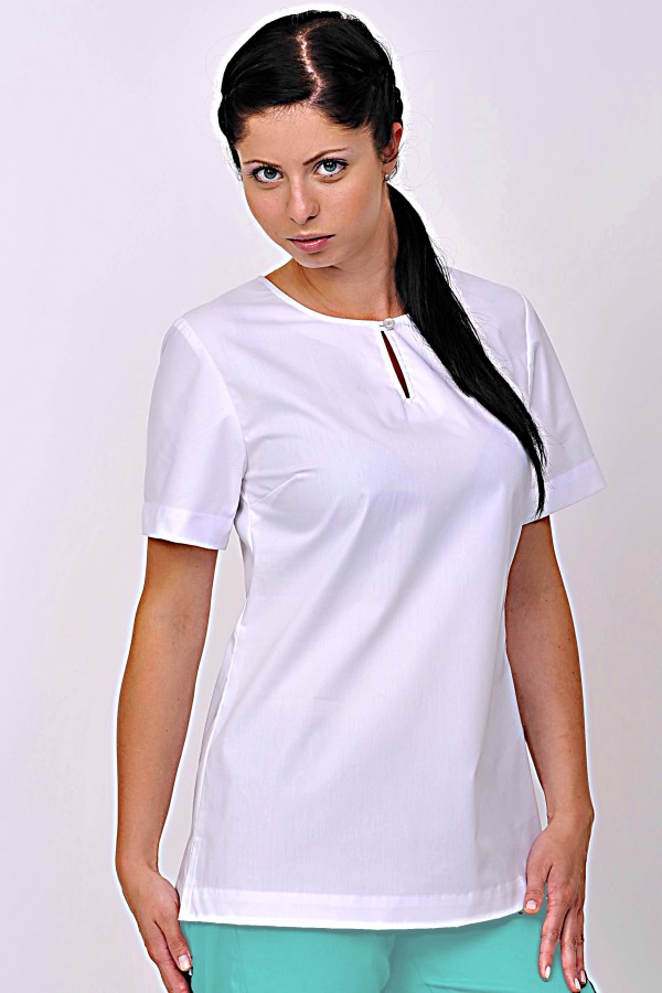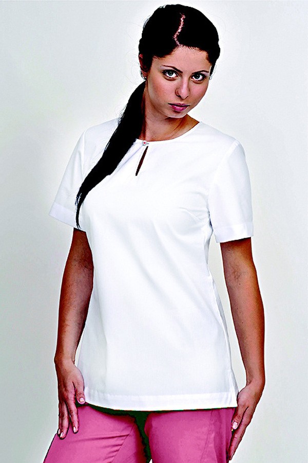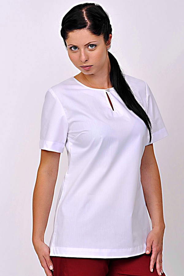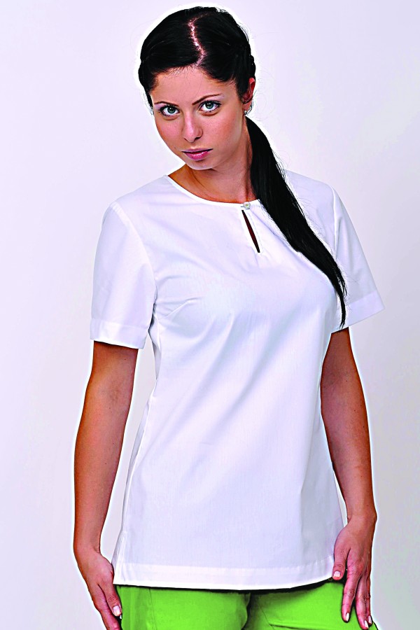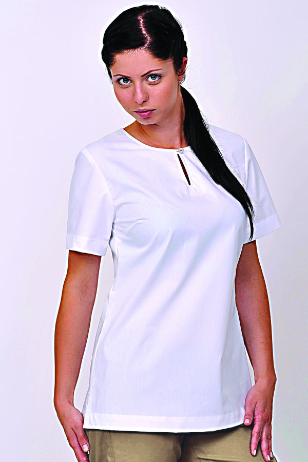 dámská halenka má elegantní střih s rozparkem ukončeným na knoflík v průkrčníku a boční rozparky pro pohodlnější nošení, halena se vyrábí v barvě bílá s barevně přišitým knoflíčkem v rozparku v průkrčníku