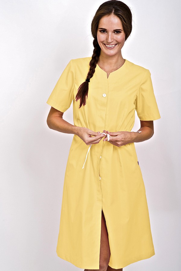 dámské šaty, kapsy, v pase stažené šňůrkou, jeden knoflík, skryté zapínání, krátký rukáv, barva: fialková, žlutá, modrá, červená, hnědá, zelená, tyrkysová, světle růžová, bílá