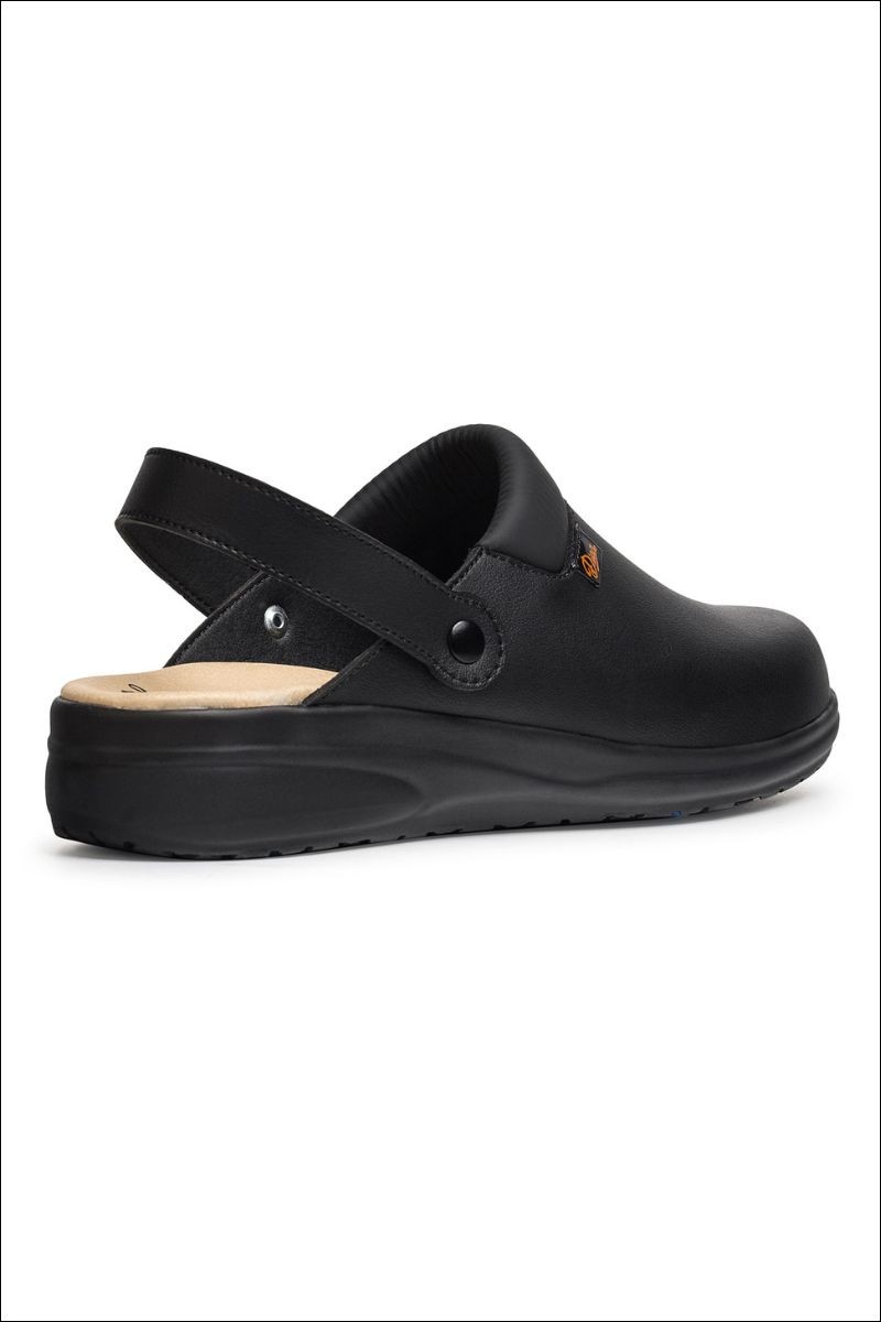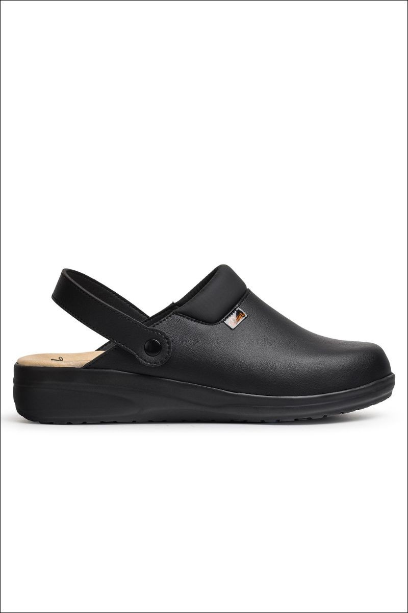 Obuv s odklápěcím páskem na patě, vyrobená z prodyšného technického mikrovlákna s výplní D'COVER OEKOTEX® na nártu pro zamezení odření. Rovné kopyto se zaoblenou špičkou. Anatomická stélka s podšívkou z technického mikrovlákna. Klínová polyuretanová podrážka s protiskluzovým vzorem s dvojitou hustotou, vyrobená z kombinace polyuretanu a TPU pro zvýšení protiskluznosti dřeváku. Vhodné pro praní ve studené vodě.