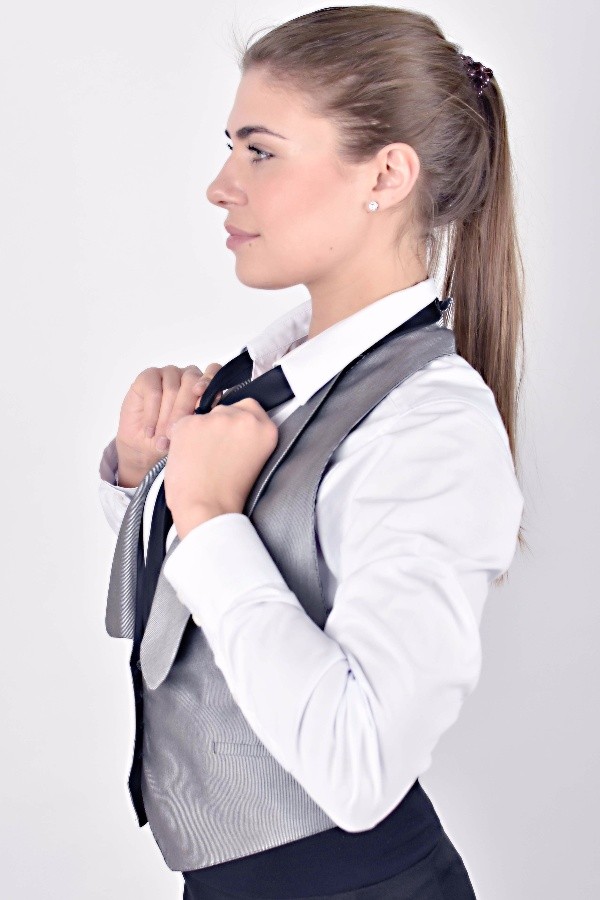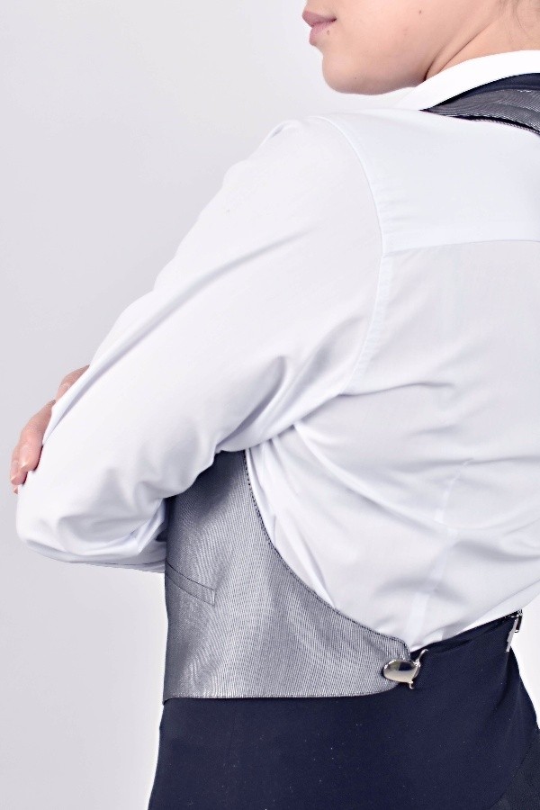 dámská vesta šedá s fazónou, jemným proužkem a volnými zády, na zádech sepnutá pruženkou.