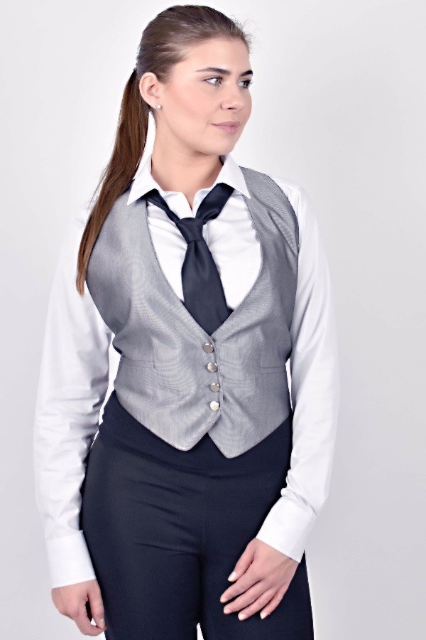 dámská vesta šedá s jemným proužkem a volnými zády, na zádech sepnutá pruženkou.