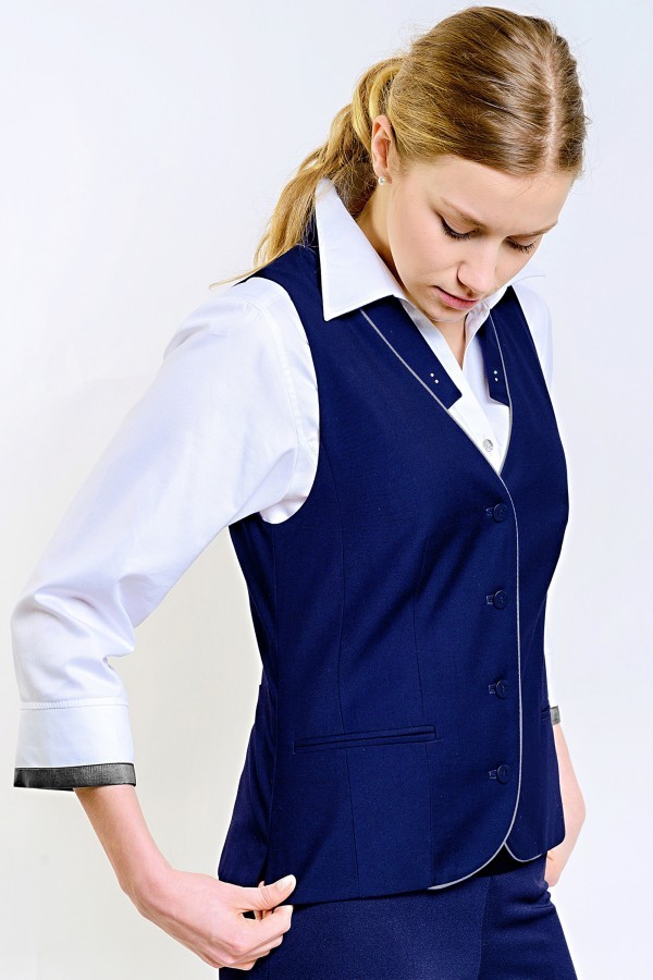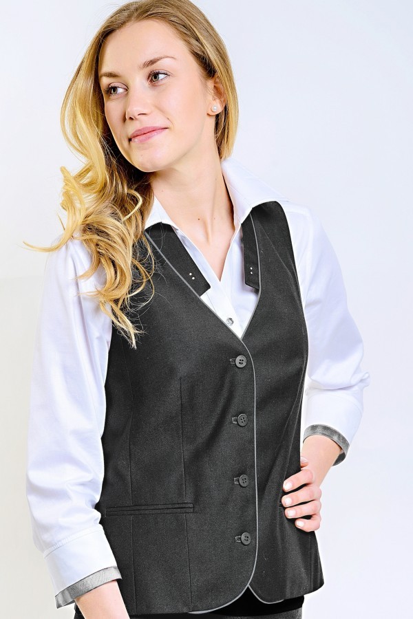 dámská vesta se stojáčkem, na kterém jsou kamínky Swarovski, přední díly jsou zdobeny stříbrně šedou výpustkou